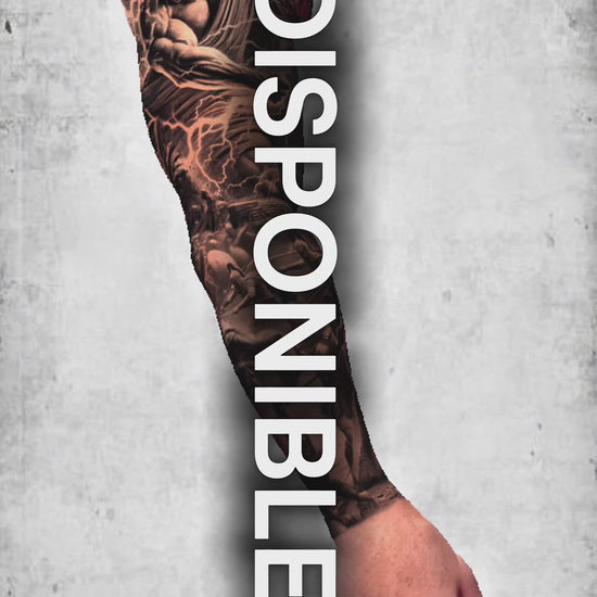 Este diseño fue creado bajo el estilo Black & Grey Abstract Realism, con una composición fluida que se adapta a la forma natural del brazo, evocando el dinamismo de la guerra en cada detalle.